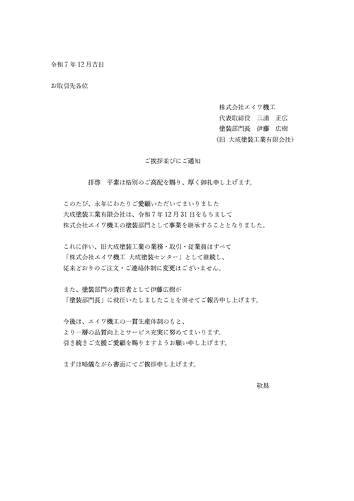 このたび、永年にわたりご愛顧いただいてまいりました大成塗装工業有限会社は、令和7年12月31日をもちまして株式会社エイワ機工の塗装部門として事業を継承することとなりました。